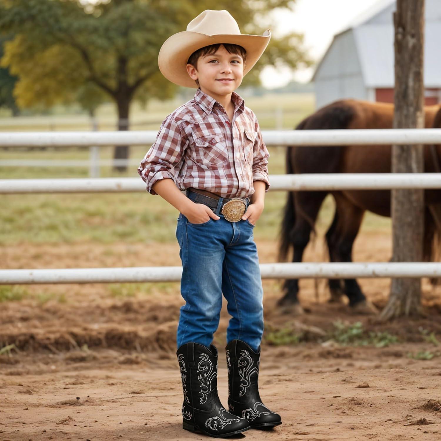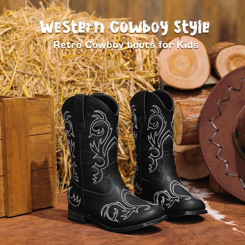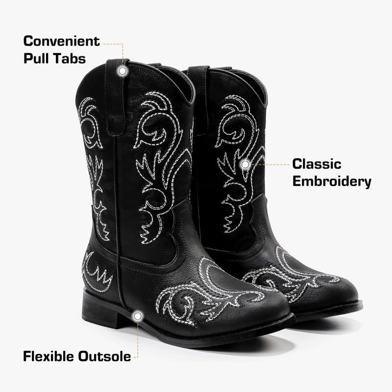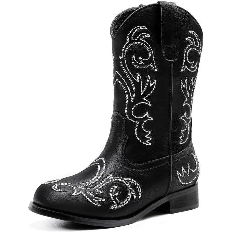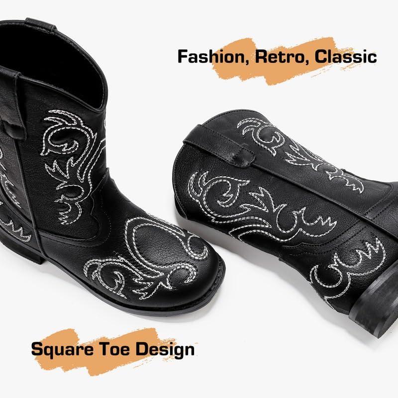 Cowboy Boots for Girls Boys Kids Cowgirl Riding Boots Square Toe Western Embroidery Mid-Calf Birthday Party Toddler Big Kid(Black)