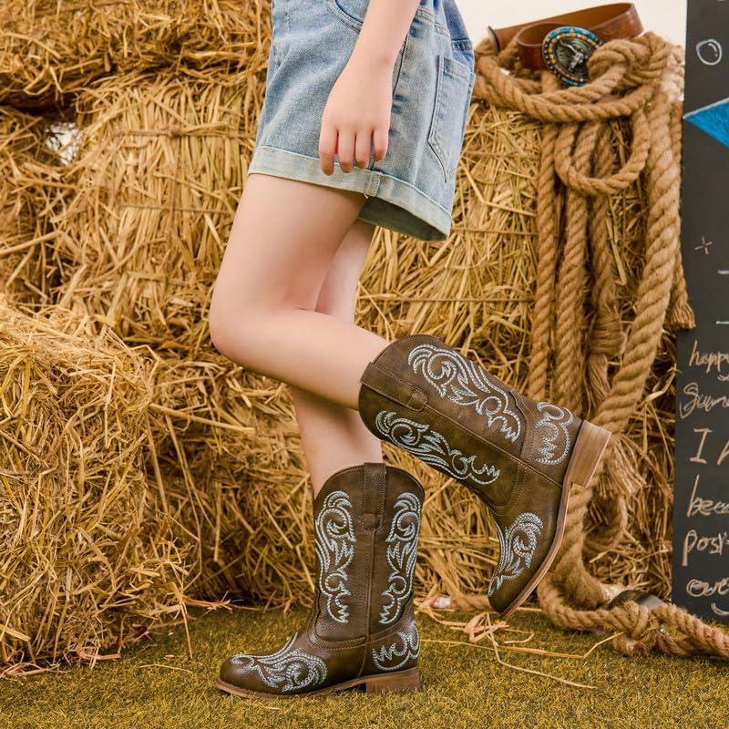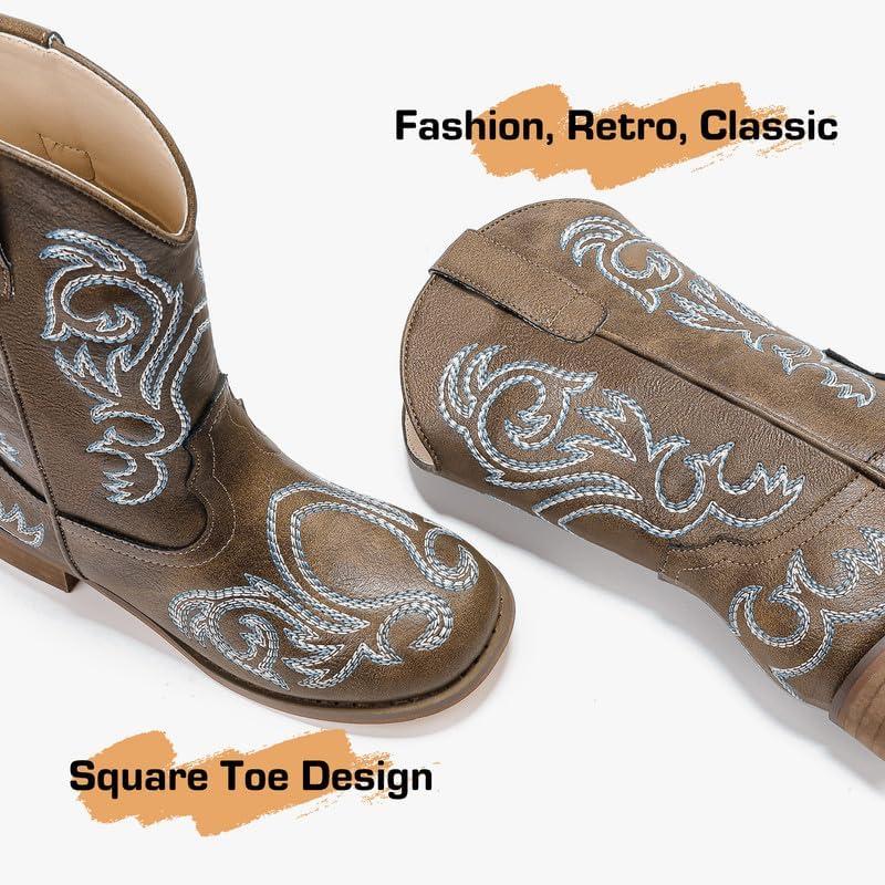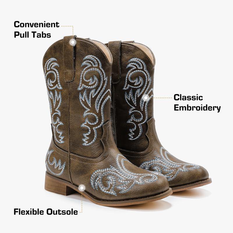 Cowboy Boots for Girls Boys Kids Cowgirl Riding Boots Square Toe Western Embroidery Mid-Calf Birthday Party Toddler Big Kid(Dark Brown)