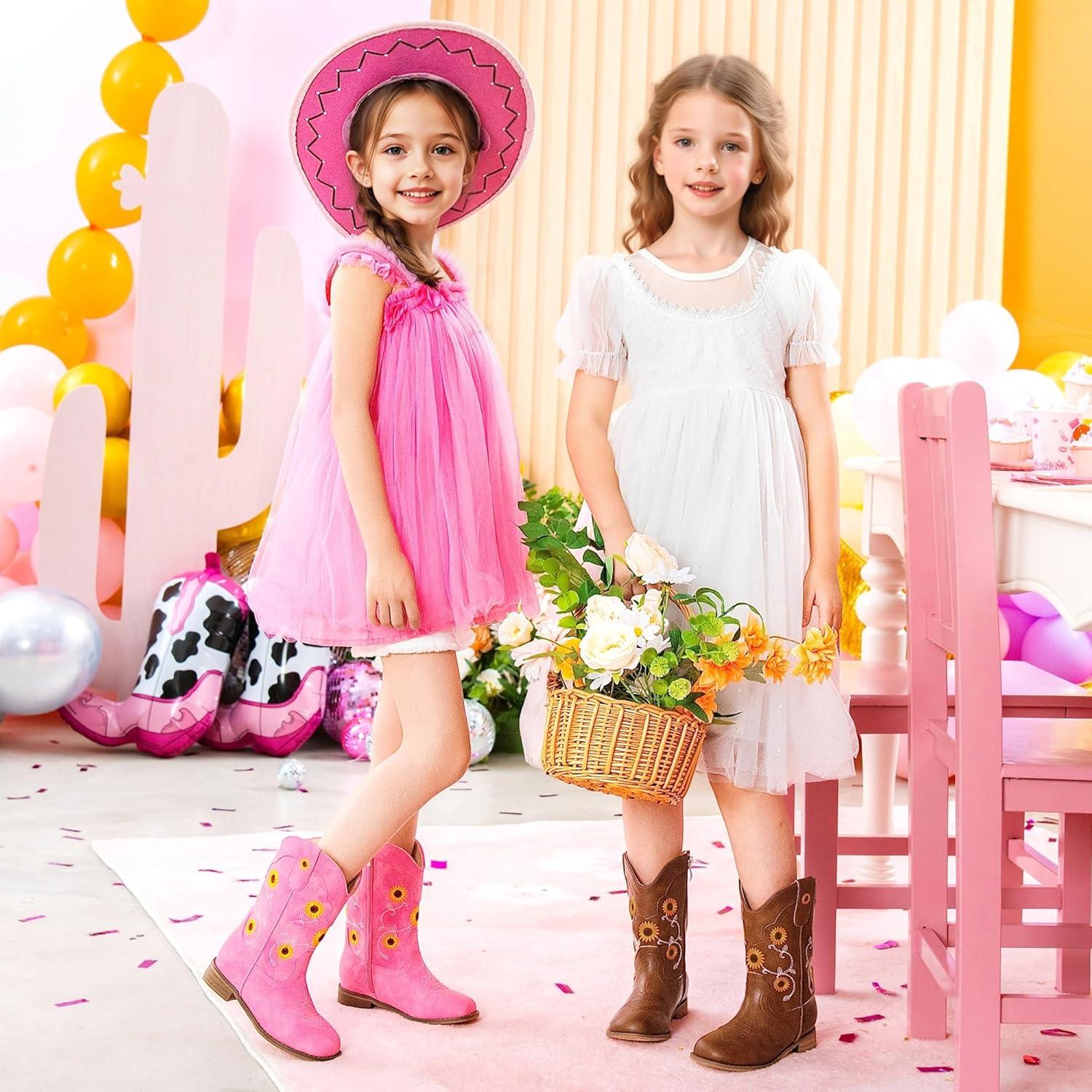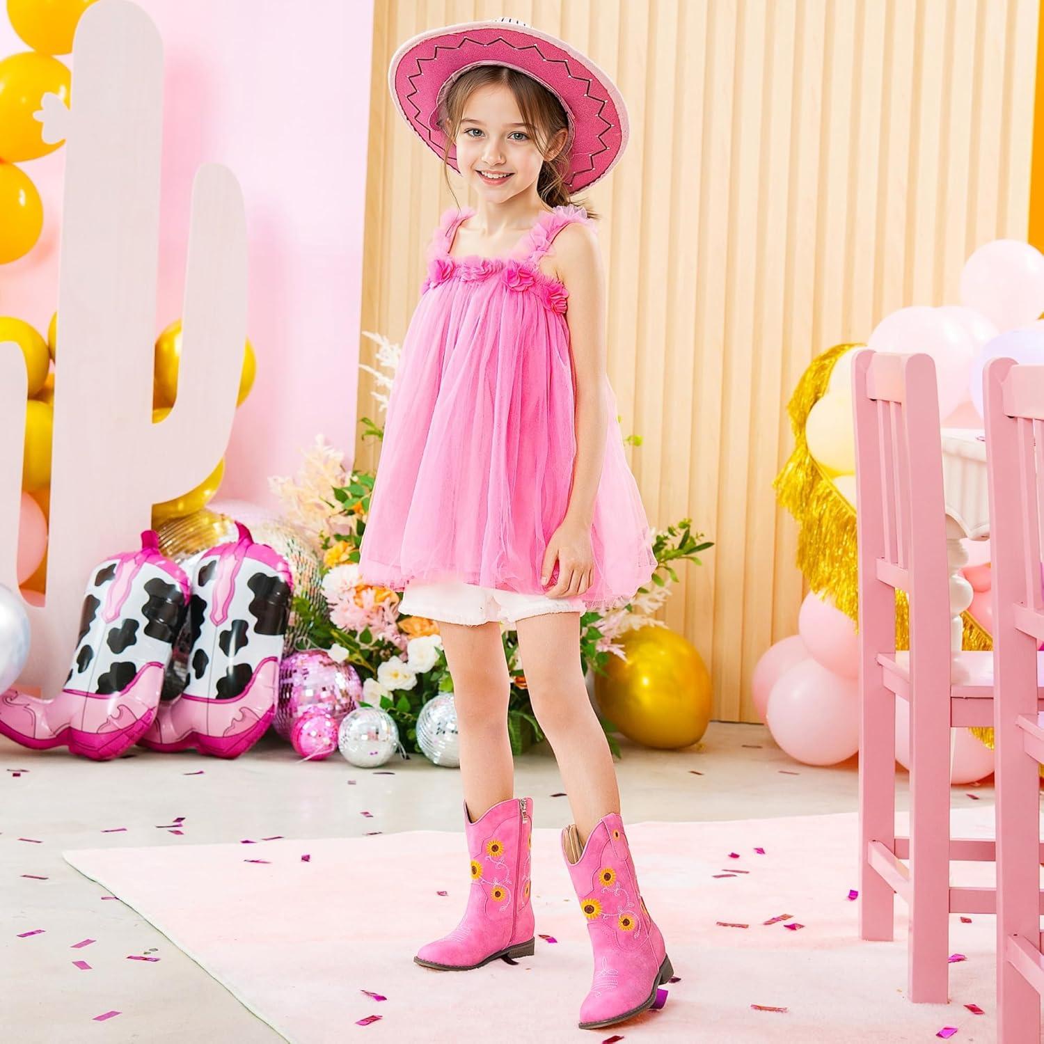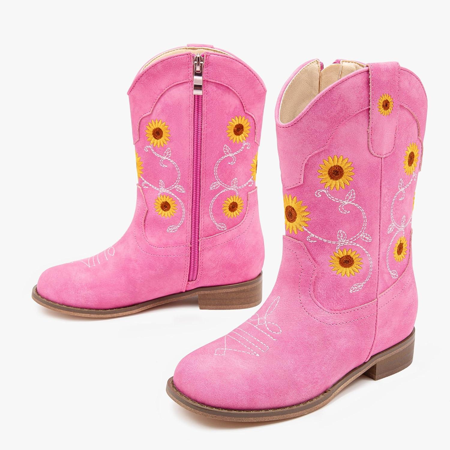 Floral Embroidered Girls Cowgirl Boots Western Cowboy Boots For Toddler To Big Kids Square Toe Mid Calf Side Zipper Horse Riding Birthday(Daisy Pink)