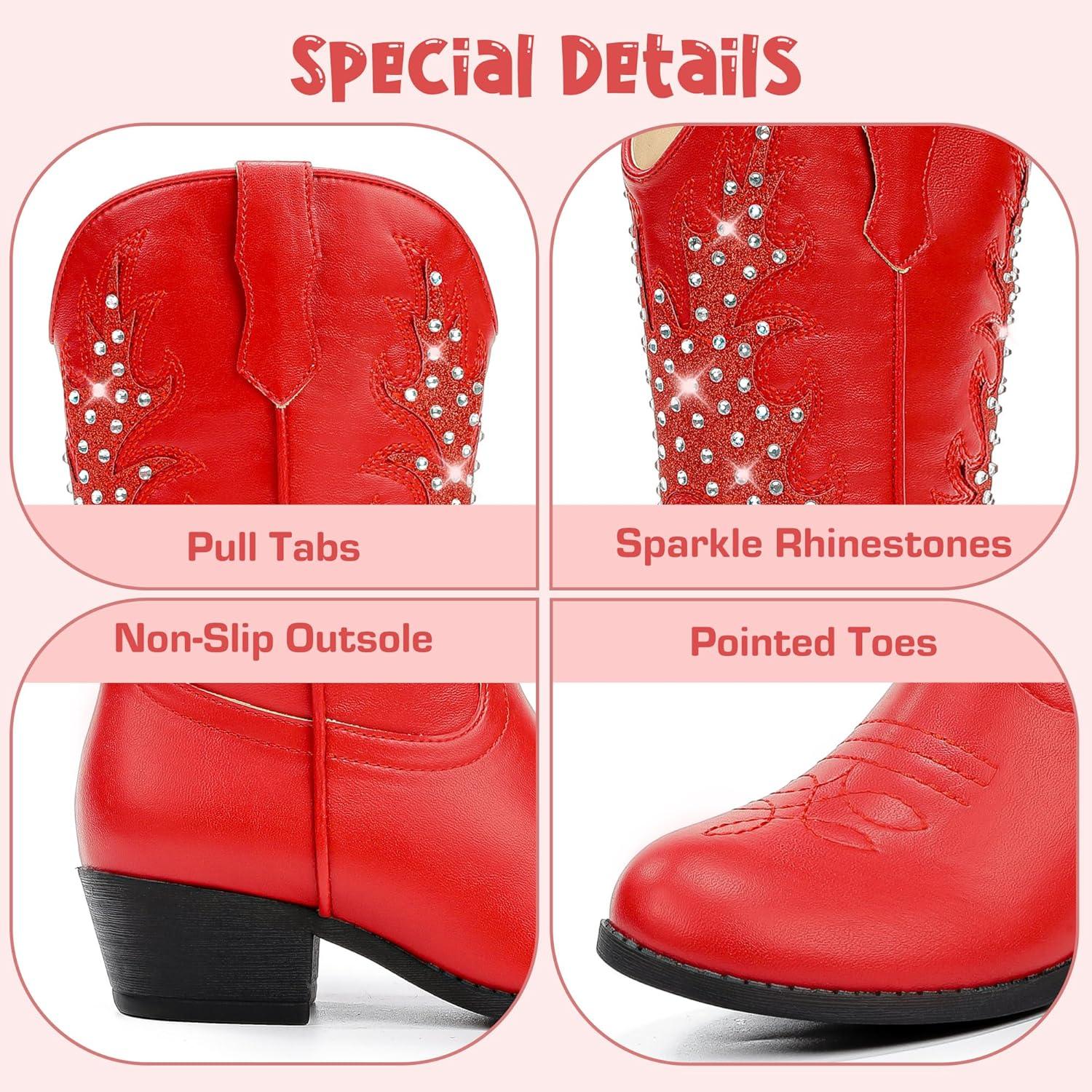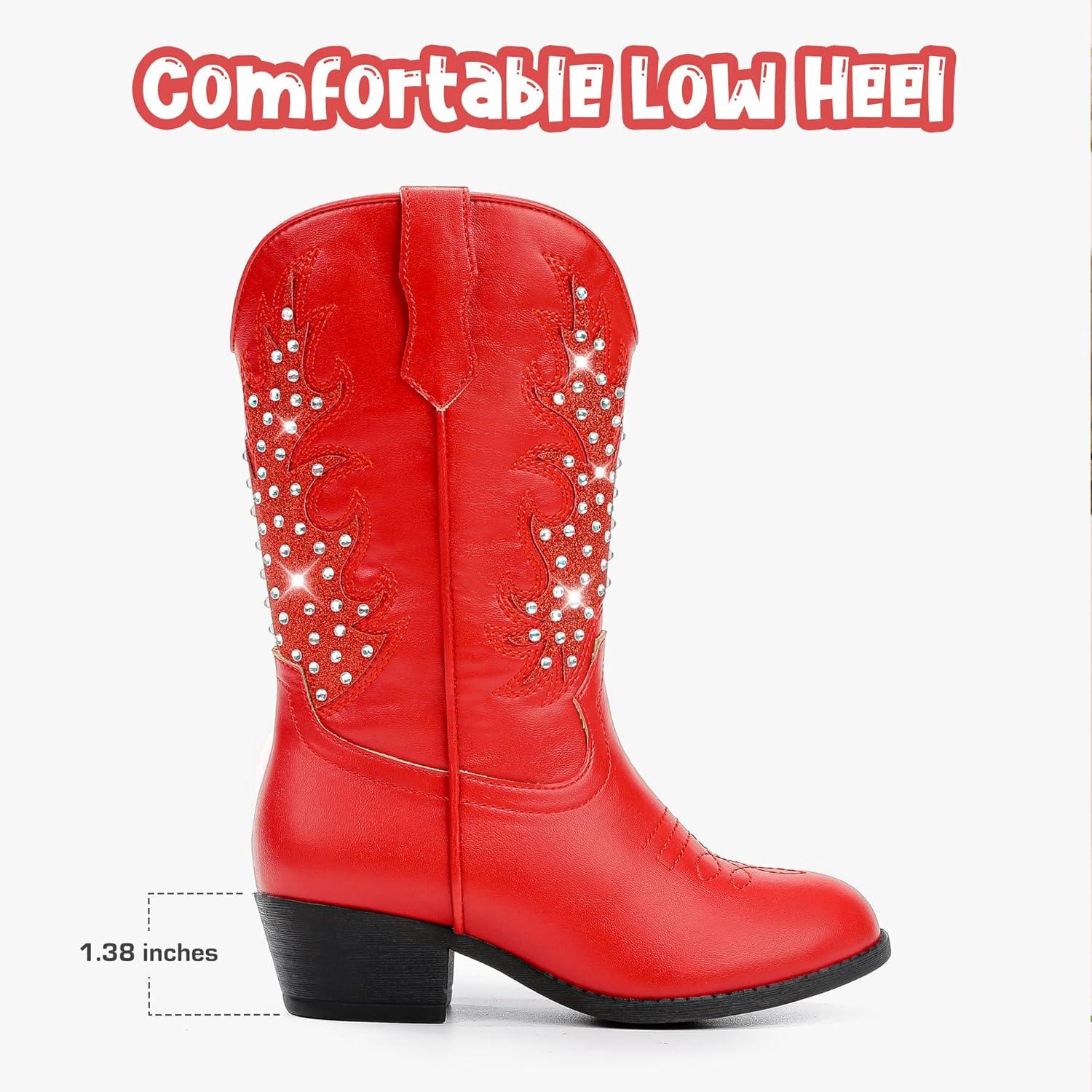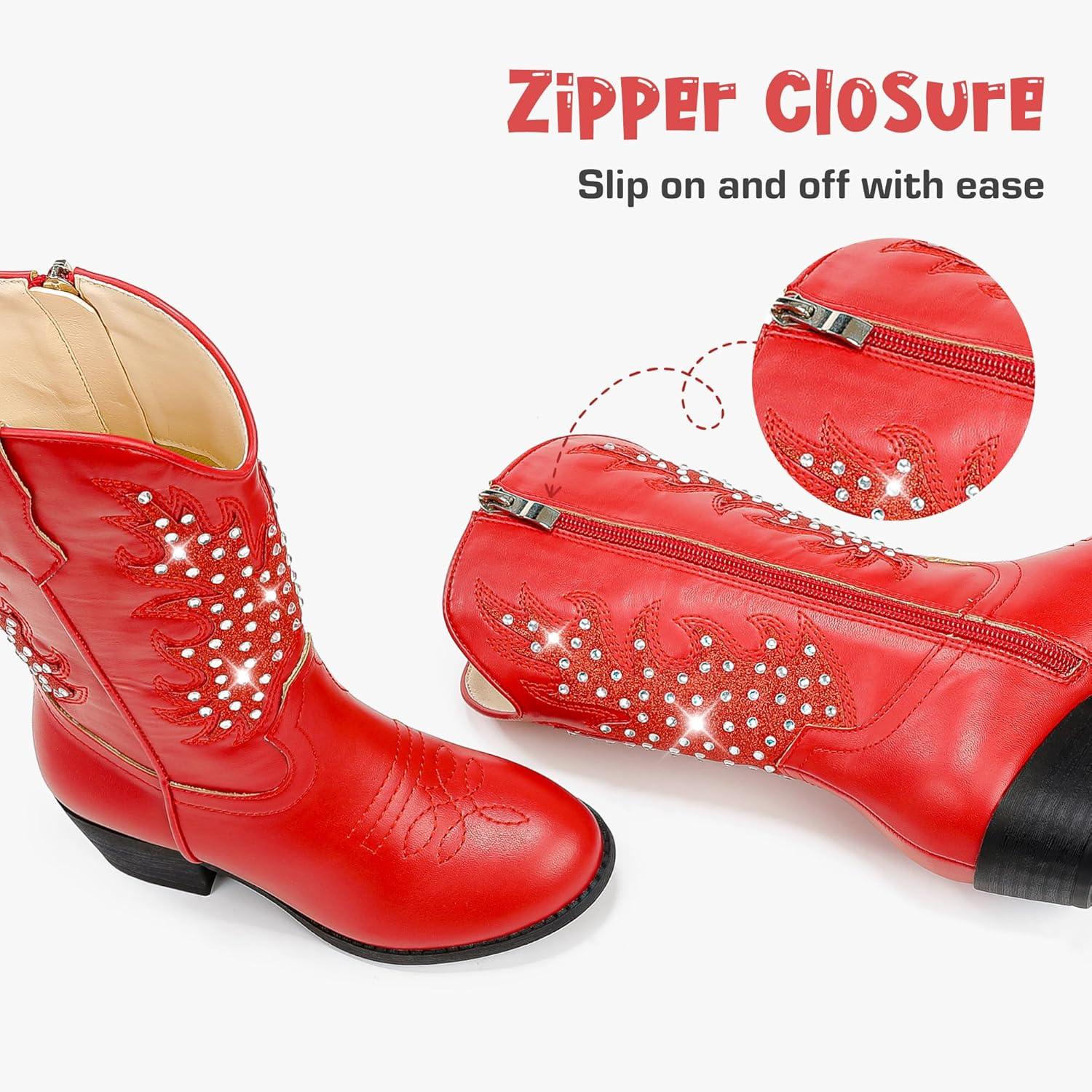 Don’t wait, get up to 50% off on Sparkly Rhinestone Cowgirl Boots Toddler to Big Kids Mid Calf Zipper Low Heel Pointed Toes Party Birthday Dress Up(Red) during our end-of-season sale event.